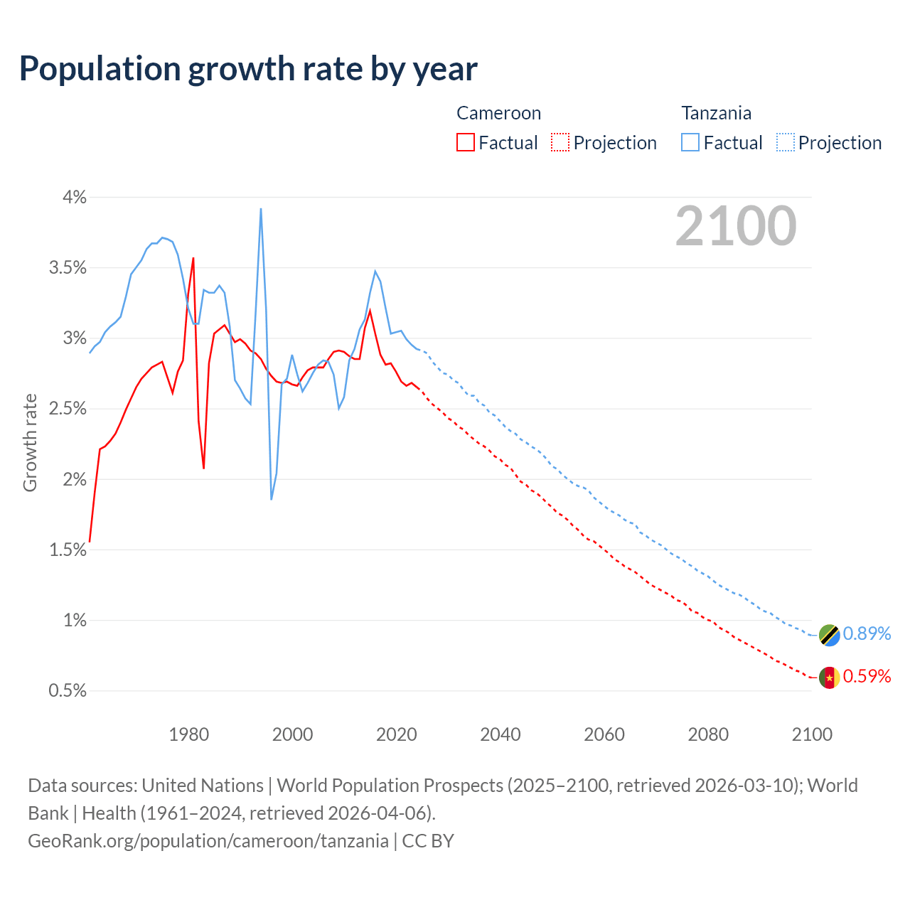 - For the last 10 years, Cameroon has had an average growth rate of +2.84% per year vs +3.13% in Tanzania.