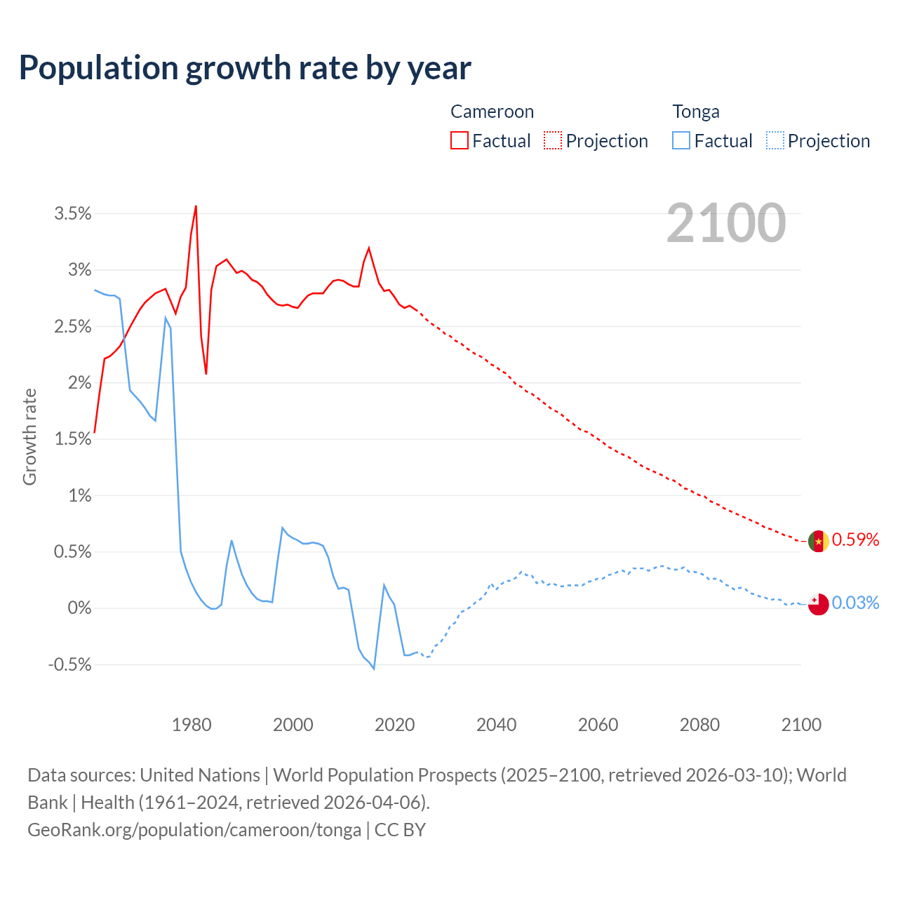 - For the last 10 years, Cameroon has had an average growth rate of +2.84% per year vs -0.25% in Tonga.