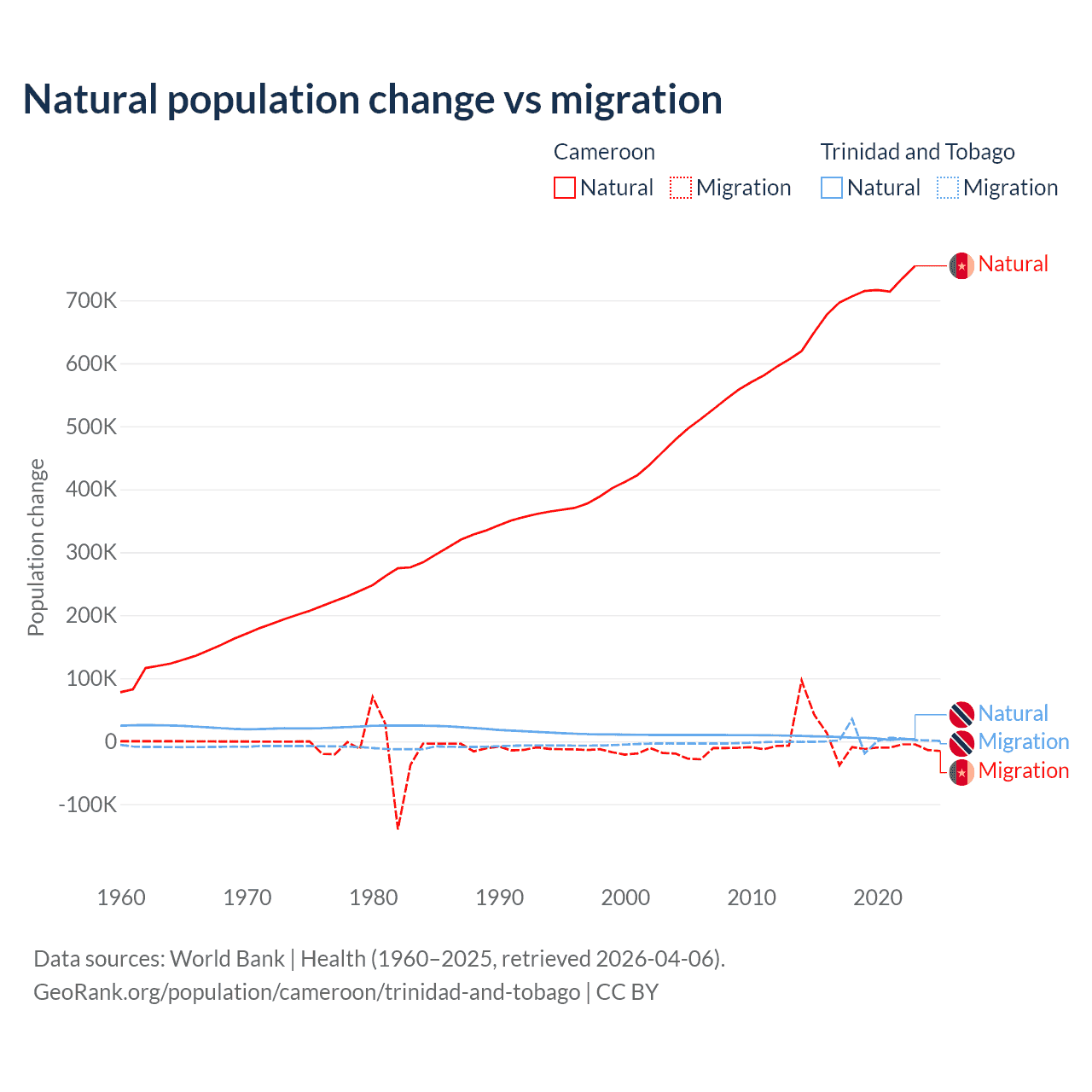Over the last 10 years, 99.1% of the population change in Cameroon is from natural causes (a gain of 6,982,395 people) and 0.9% is from migration (a gain of 63,139 people). In Trinidad and Tobago 66% is from natural causes (a gain of 55,887 people) and 34% is from migration (a gain of 28,785 people).