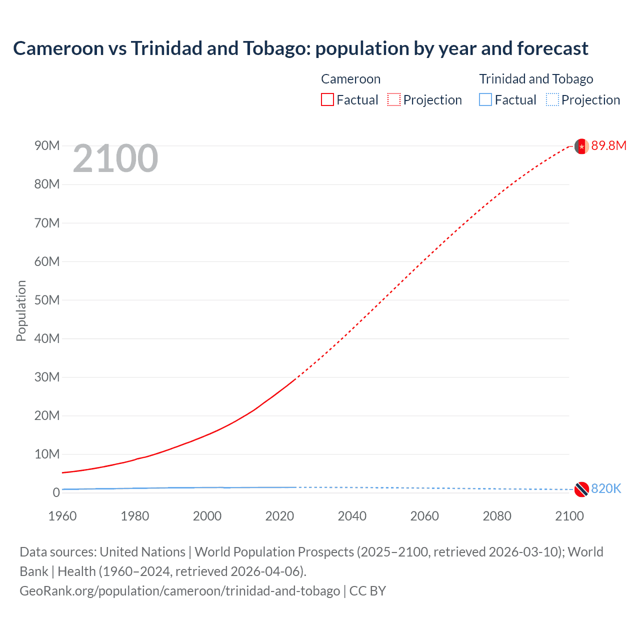 The latest officially reported population of Cameroon was 29,123,744 in 2024 vs 1,368,333 people in Trinidad and Tobago in 2024. In 2026, based on the adjusted UN estimation, the current Cameroon's population is 30,864,115 people compared to 1,374,840 in Trinidad and Tobago.