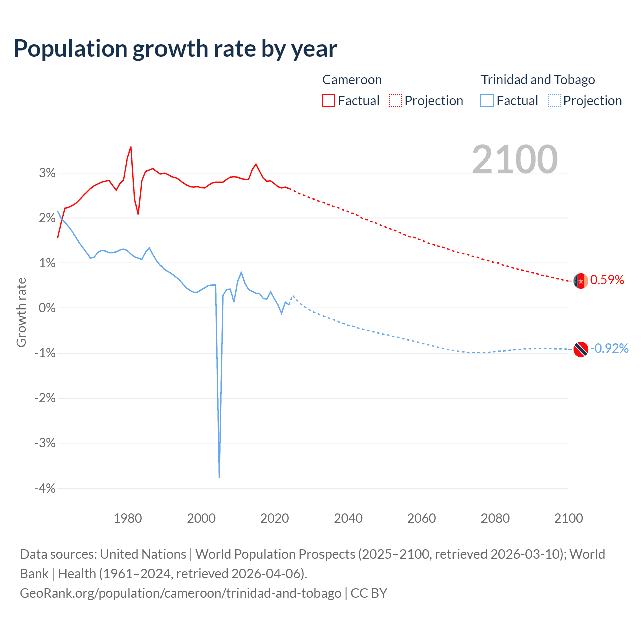 - For the last 10 years, Cameroon has had an average growth rate of +2.84% per year vs +0.19% in Trinidad and Tobago.
