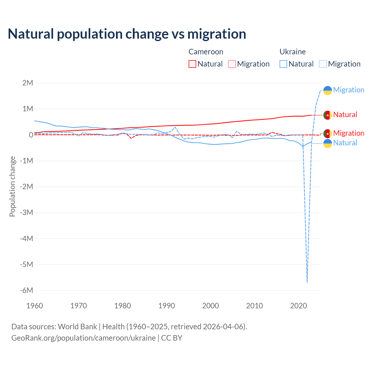Over the last 10 years, 99.1% of the population change in Cameroon is from natural causes (a gain of 6,982,395 people) and 0.9% is from migration (a gain of 63,139 people). In Ukraine 28.2% is from natural causes (a loss of 2,435,153 people) and 71.8% is from migration (a loss of 6,198,995 people).