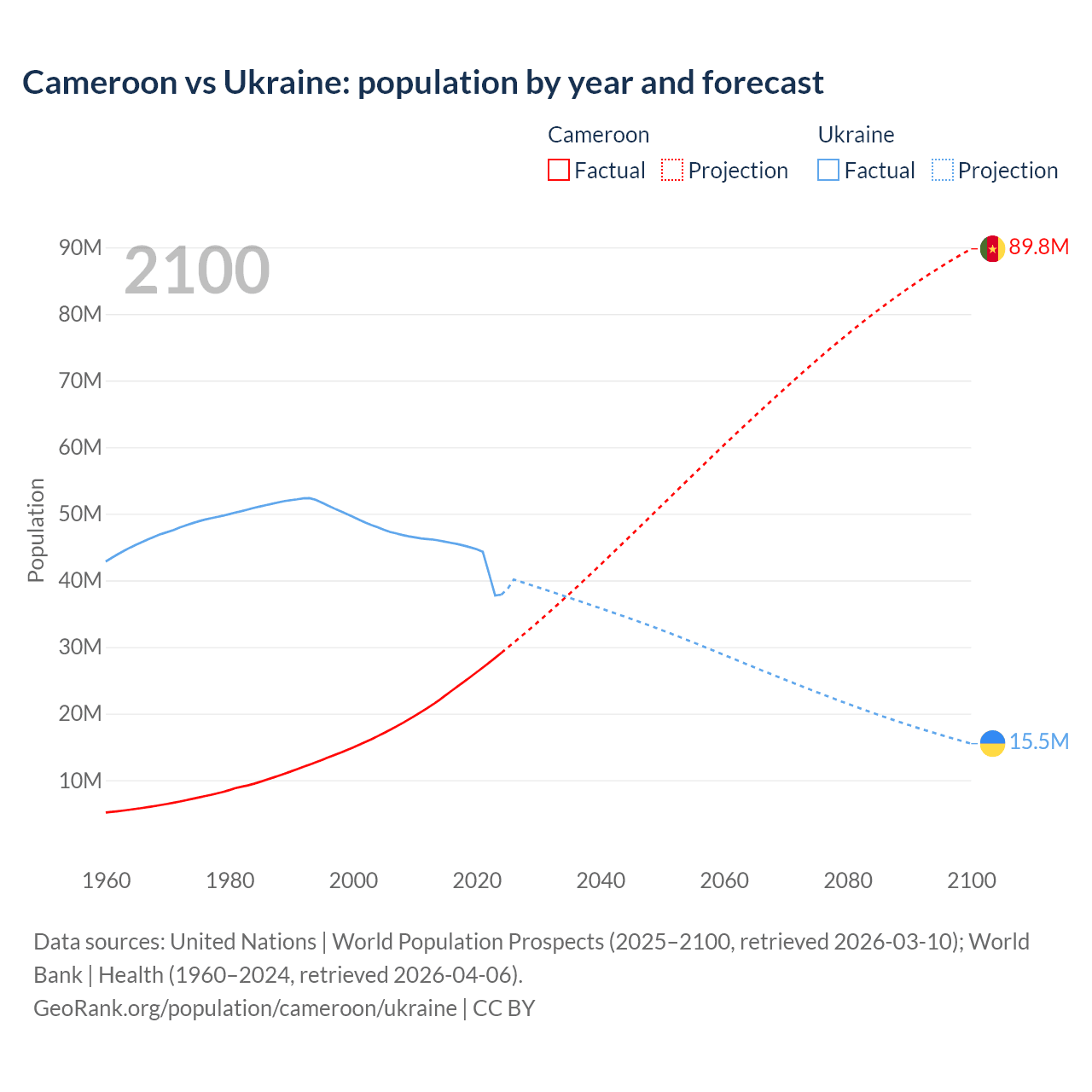 The latest officially reported population of Cameroon was 29,123,744 in 2024 vs 37,860,221 people in Ukraine in 2024. In 2026, based on the adjusted UN estimation, the current Cameroon's population is 30,864,115 people compared to 40,125,599 in Ukraine.