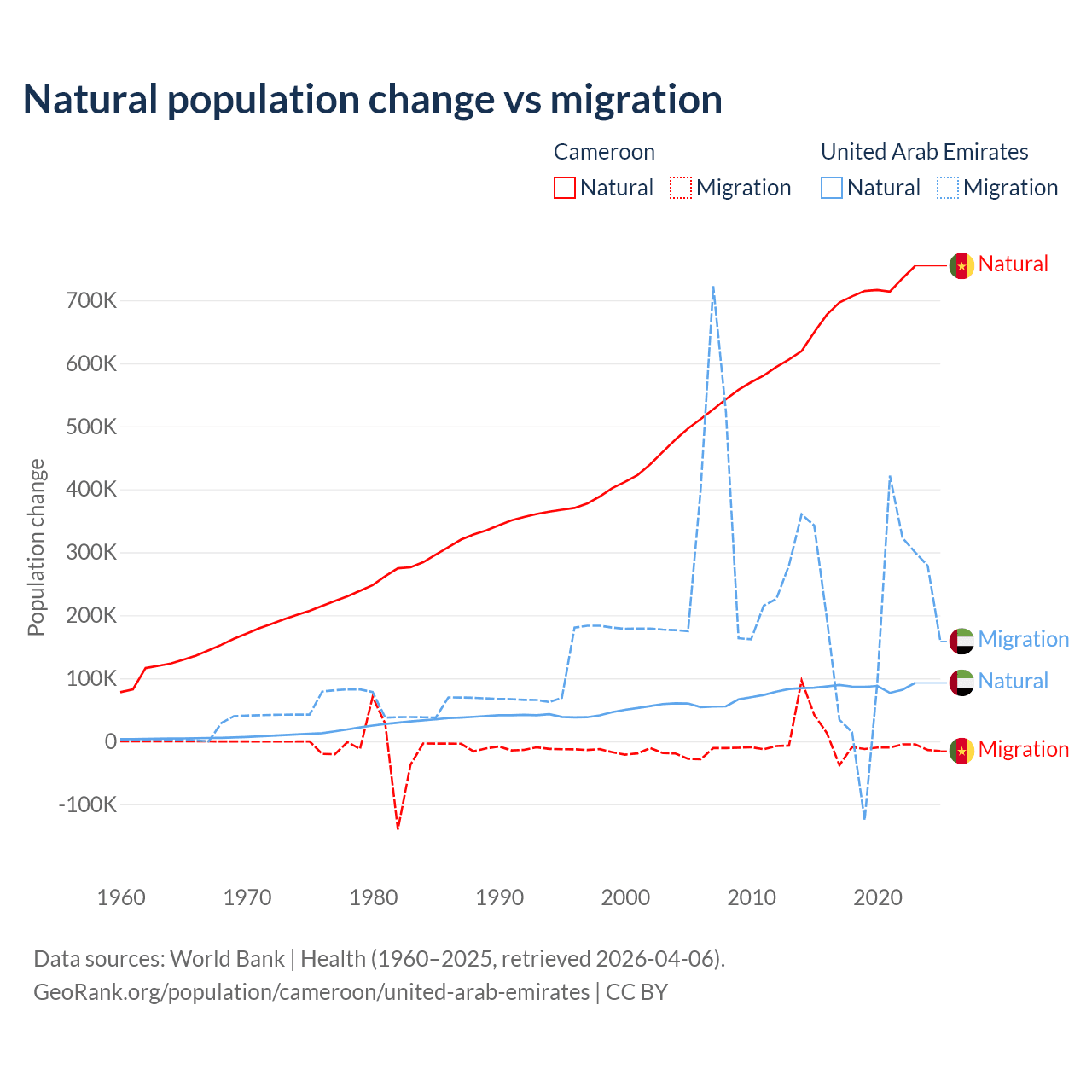 Over the last 10 years, 99.1% of the population change in Cameroon is from natural causes (a gain of 6,982,395 people) and 0.9% is from migration (a gain of 63,139 people). In the United Arab Emirates 30.5% is from natural causes (a gain of 857,996 people) and 69.5% is from migration (a gain of 1,958,520 people).