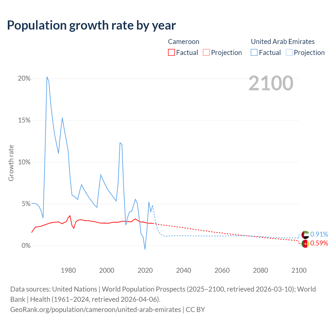 - For the last 10 years, Cameroon has had an average growth rate of +2.84% per year vs +3.31% in the United Arab Emirates.