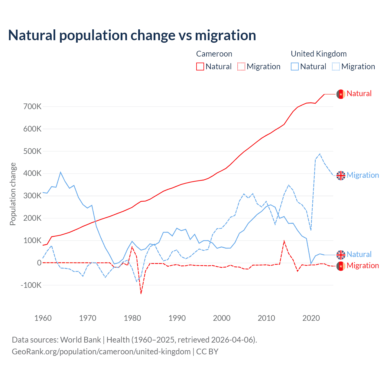 Over the last 10 years, 99.1% of the population change in Cameroon is from natural causes (a gain of 6,982,395 people) and 0.9% is from migration (a gain of 63,139 people). In the United Kingdom 23.9% is from natural causes (a gain of 1,033,129 people) and 76.1% is from migration (a gain of 3,283,101 people).