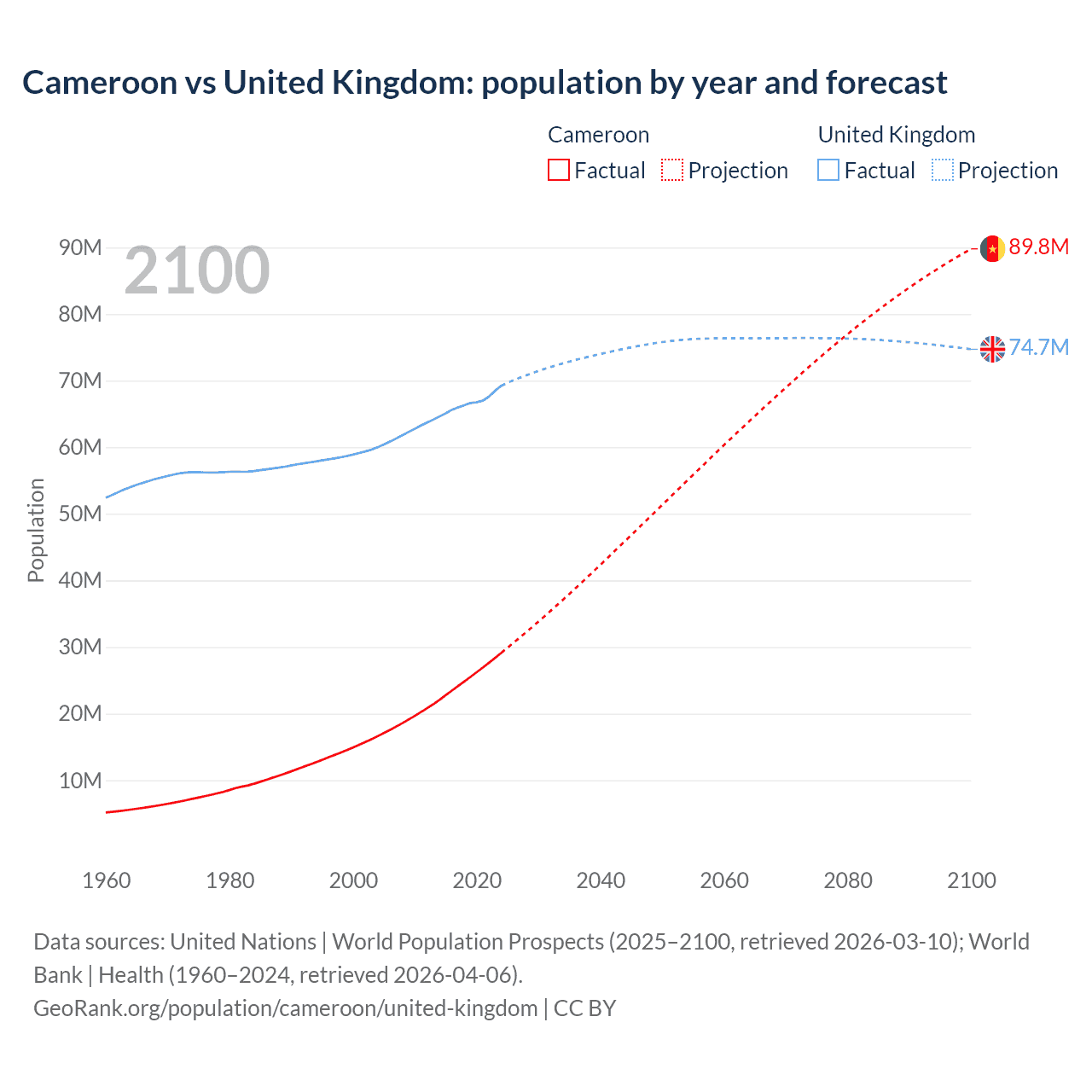 The latest officially reported population of Cameroon was 29,123,744 in 2024 vs 69,226,000 people in the United Kingdom in 2024. In 2026, based on the adjusted UN estimation, the current Cameroon's population is 30,864,115 people compared to 70,154,914 in the United Kingdom.