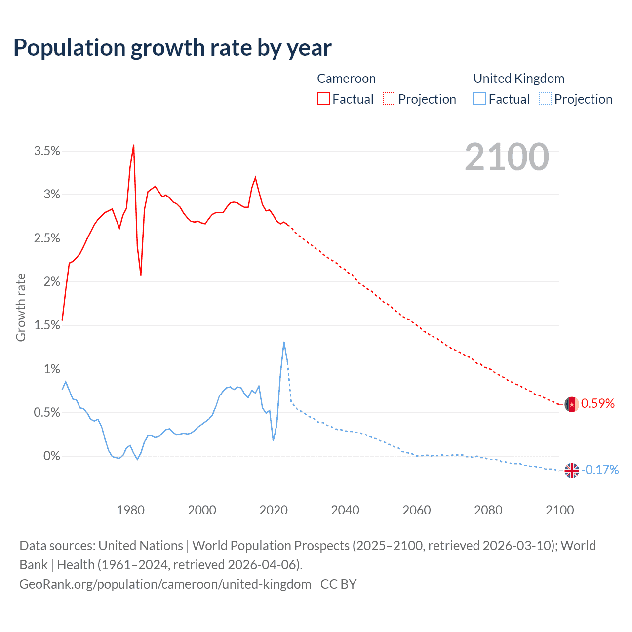 - For the last 10 years, Cameroon has had an average growth rate of +2.84% per year vs +0.7% in the United Kingdom.