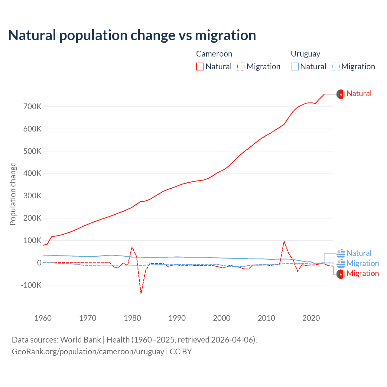 Over the last 10 years, 99.1% of the population change in Cameroon is from natural causes (a gain of 6,982,395 people) and 0.9% is from migration (a gain of 63,139 people). In Uruguay 70% is from natural causes (a gain of 64,303 people) and 30% is from migration (a loss of 27,501 people).
