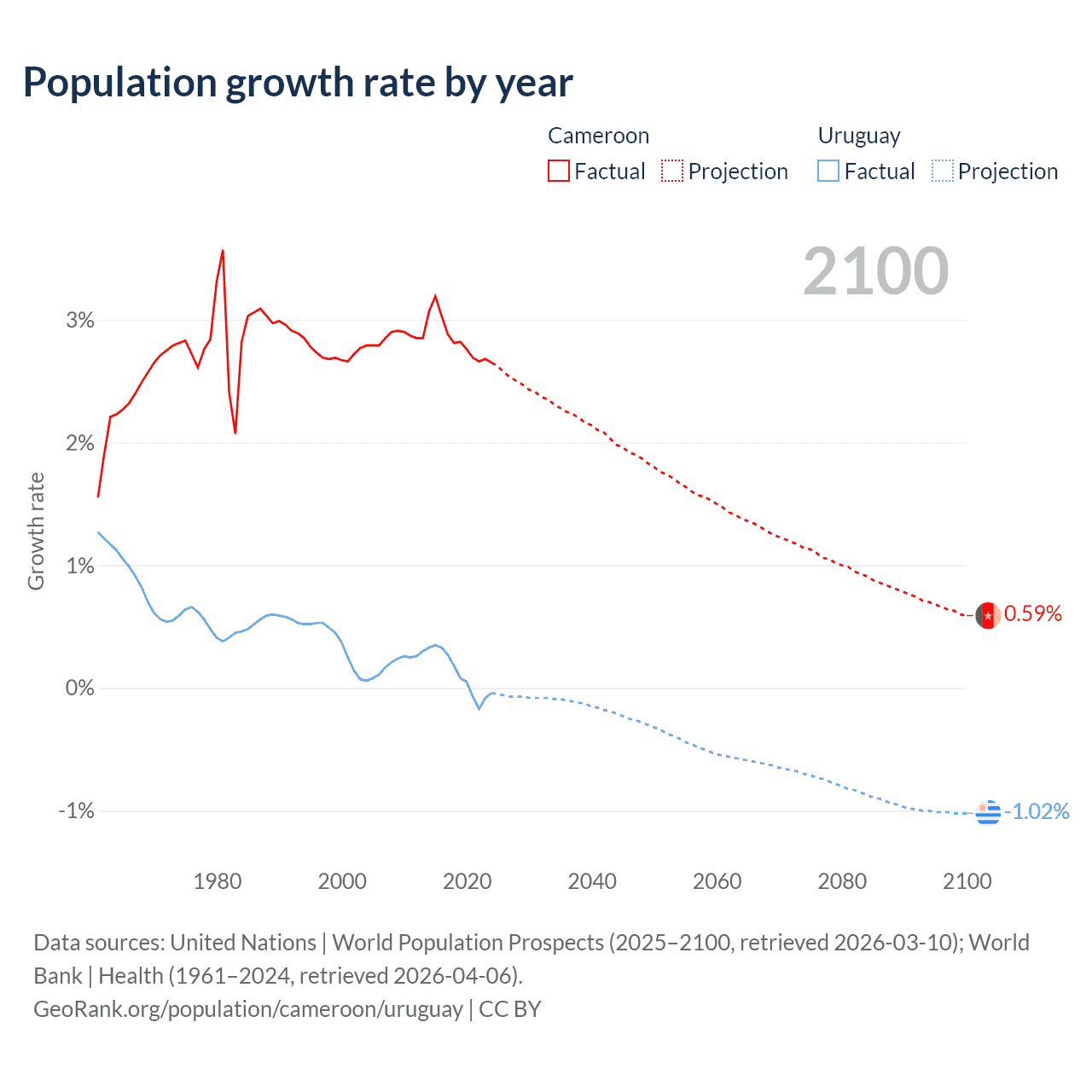 - For the last 10 years, Cameroon has had an average growth rate of +2.84% per year vs +0.11% in Uruguay.