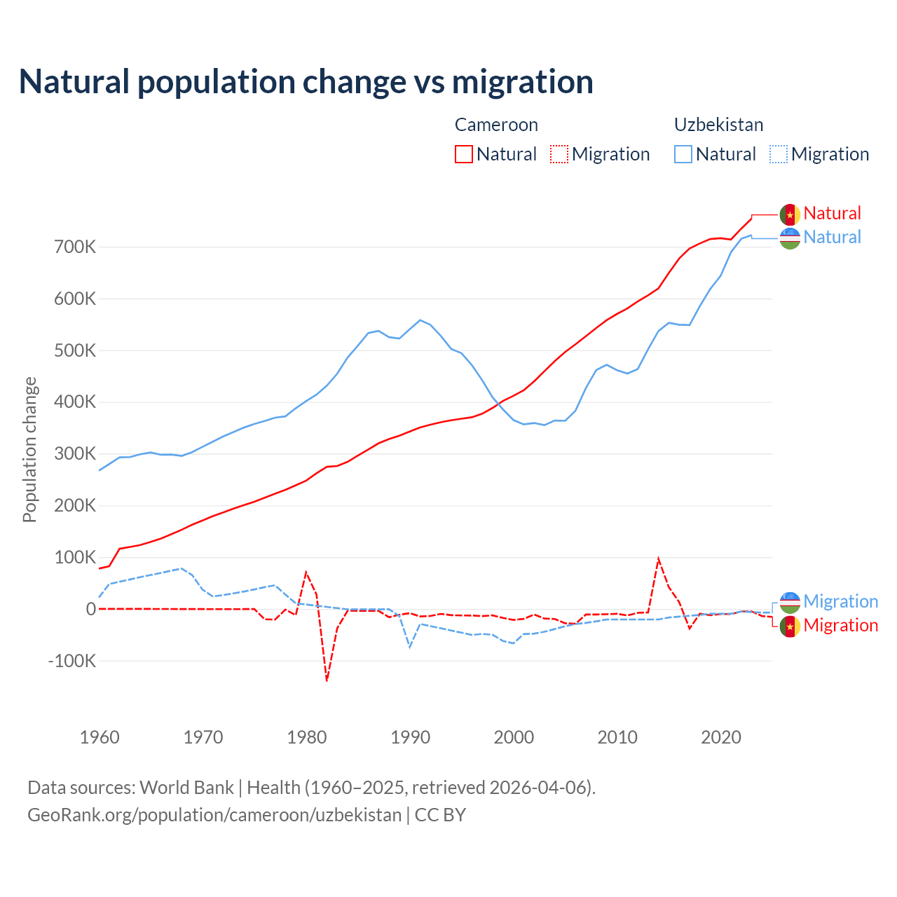 Over the last 10 years, 99.1% of the population change in Cameroon is from natural causes (a gain of 6,982,395 people) and 0.9% is from migration (a gain of 63,139 people). In Uzbekistan 98.2% is from natural causes (a gain of 6,161,117 people) and 1.84% is from migration (a loss of 115,398 people).