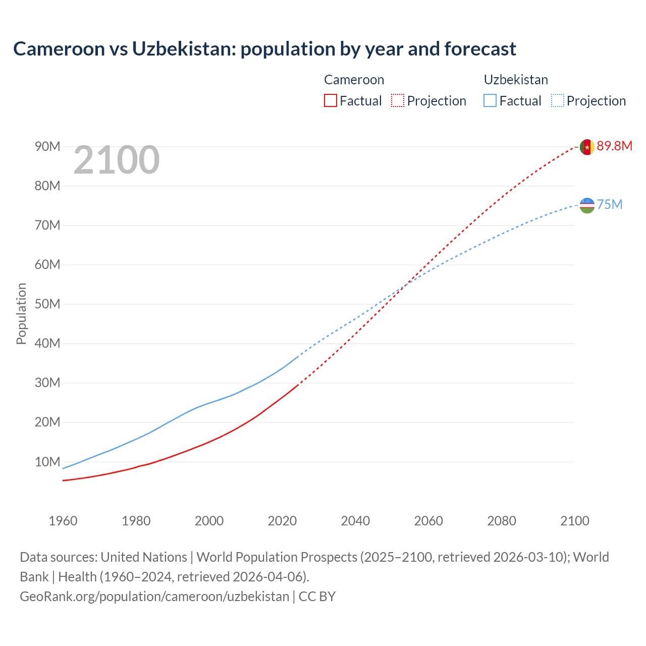 Cameroon vs Uzbekistan: population by year and forecast