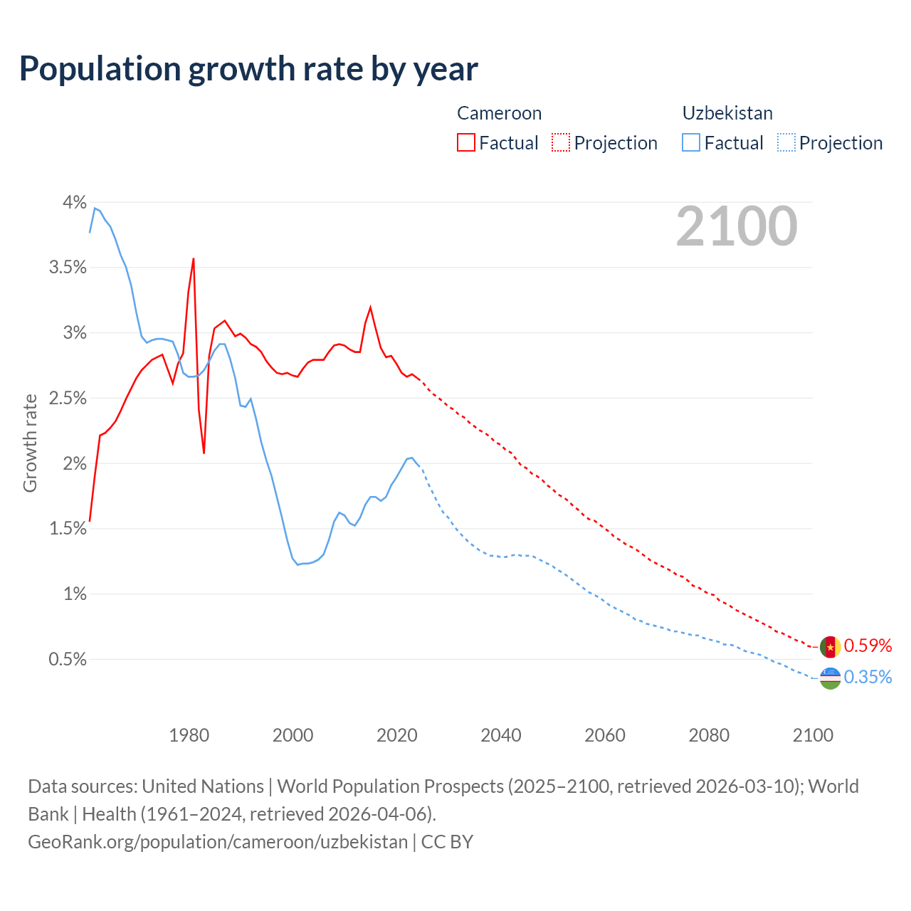 Data sources: World Bank | Health (1960–2024, retrieved 2026-04-06); United Nations | World Population Prospects (1960–2026, retrieved 2026-03-10); U.S. Census Bureau (1960–2025, retrieved 2026-02-08); Central Intelligence Agency (CIA) (2000–2019, retrieved 2026-02-20).