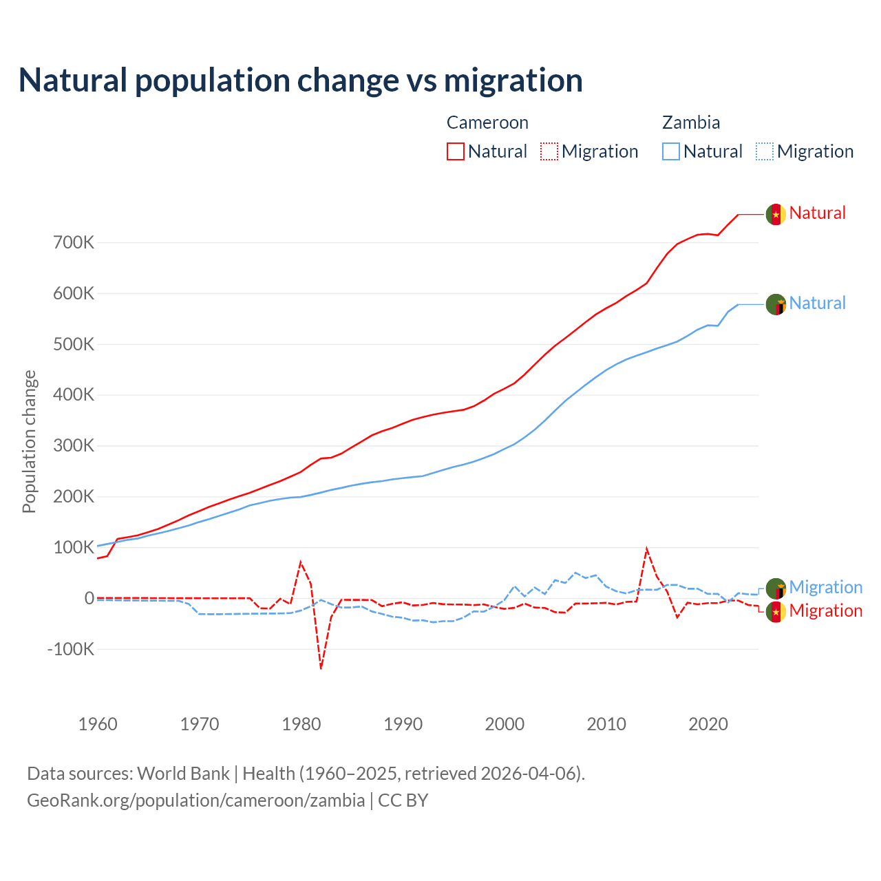 Over the last 10 years, 99.1% of the population change in Cameroon is from natural causes (a gain of 6,982,395 people) and 0.9% is from migration (a gain of 63,139 people). In Zambia 97.4% is from natural causes (a gain of 5,233,797 people) and 2.58% is from migration (a gain of 138,554 people).