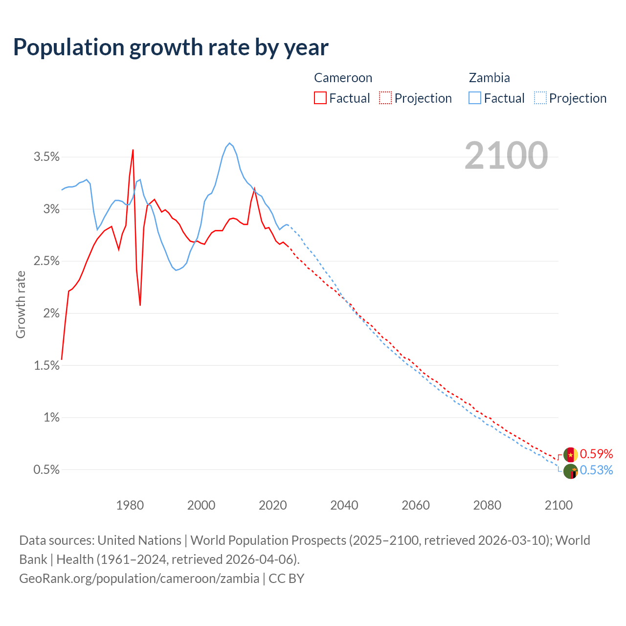 Cameroon vs Zambia: population by year and forecast