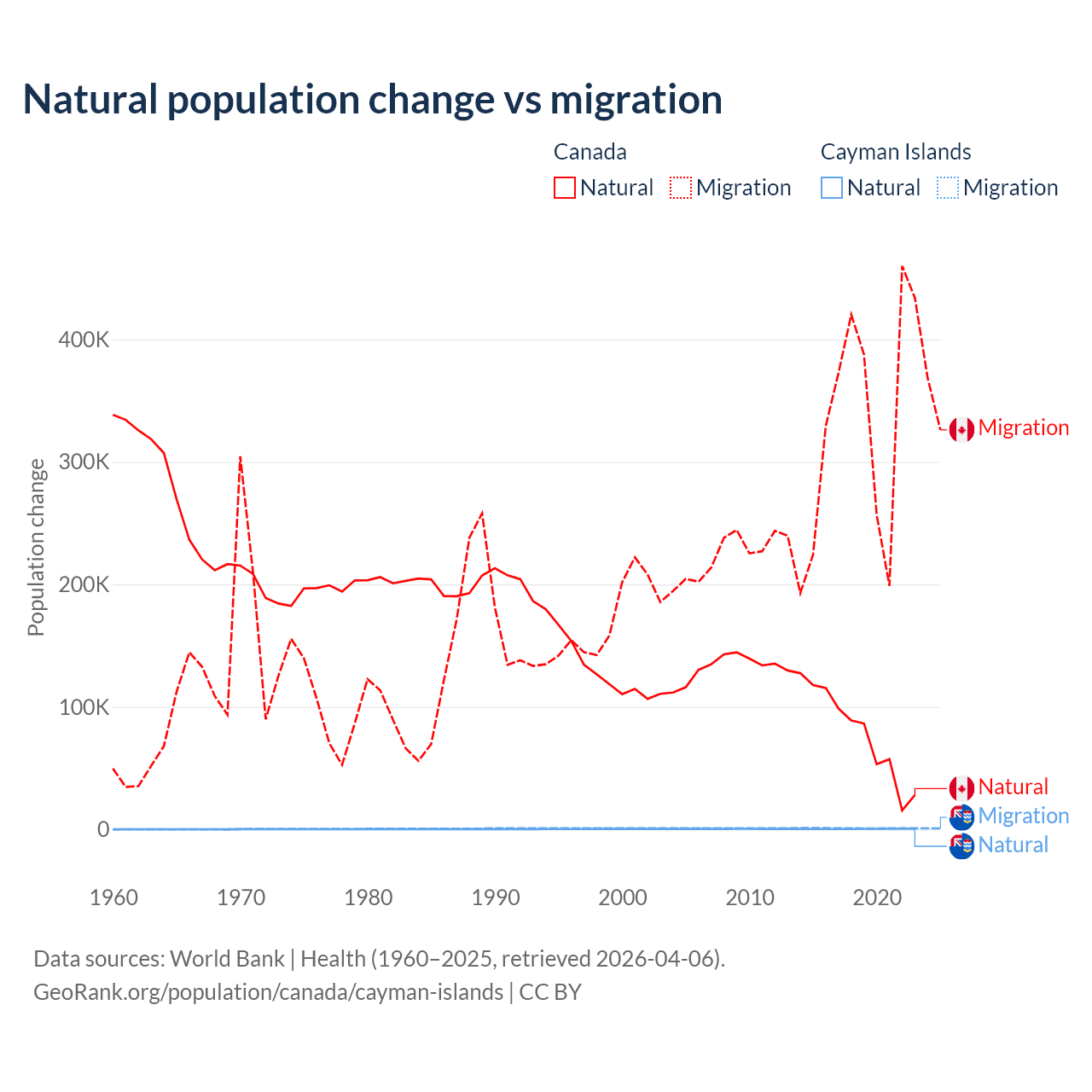 Over the last 10 years, 19.4% of the population change in Canada is from natural causes (a gain of 789,345 people) and 80.6% is from migration (a gain of 3,276,554 people). In the Cayman Islands 31.1% is from natural causes (a gain of 4,468 people) and 68.9% is from migration (a gain of 9,879 people).