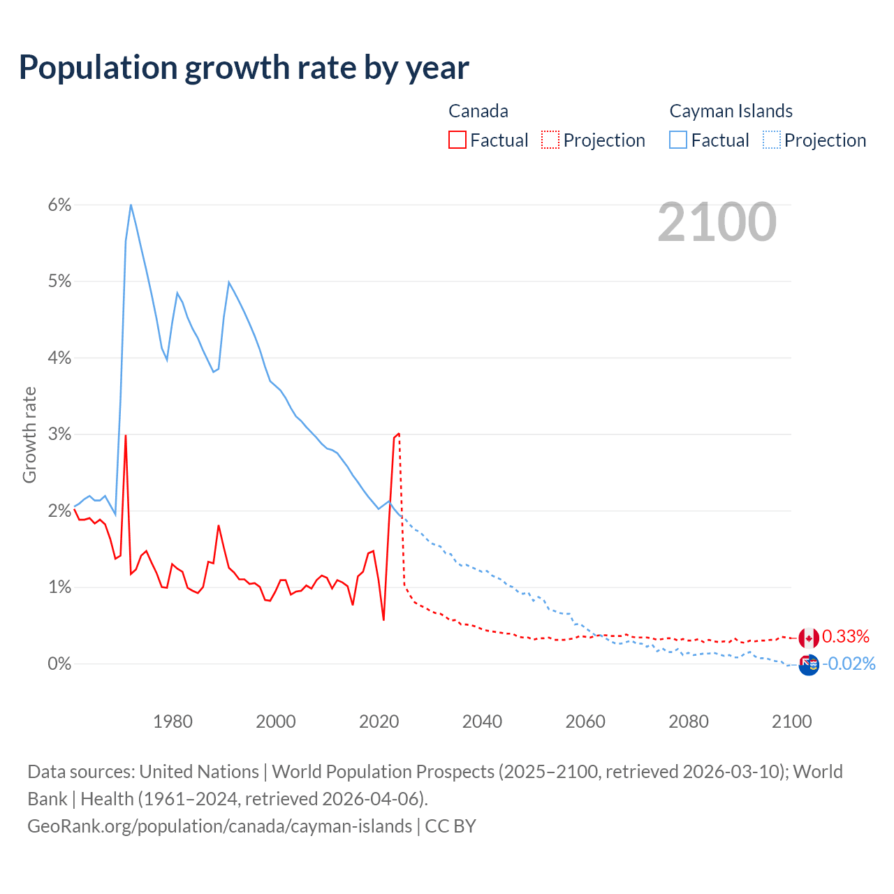 Data sources: World Bank | Health (1960–2024, retrieved 2026-04-06); United Nations | World Population Prospects (1960–2026, retrieved 2026-03-10); U.S. Census Bureau (1960–2025, retrieved 2026-02-08); Central Intelligence Agency (CIA) (2000–2019, retrieved 2026-02-20).