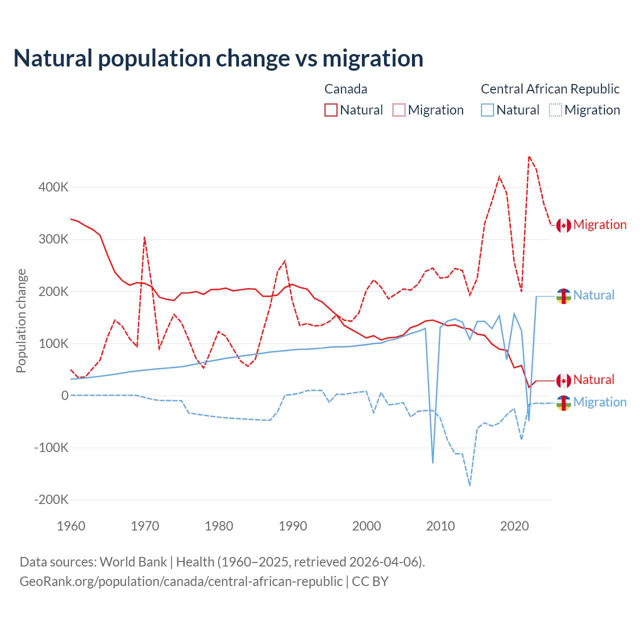 Over the last 10 years, 19.4% of the population change in Canada is from natural causes (a gain of 789,345 people) and 80.6% is from migration (a gain of 3,276,554 people). In the Central African Republic 66.7% is from natural causes (a gain of 1,164,312 people) and 33.3% is from migration (a loss of 580,593 people).