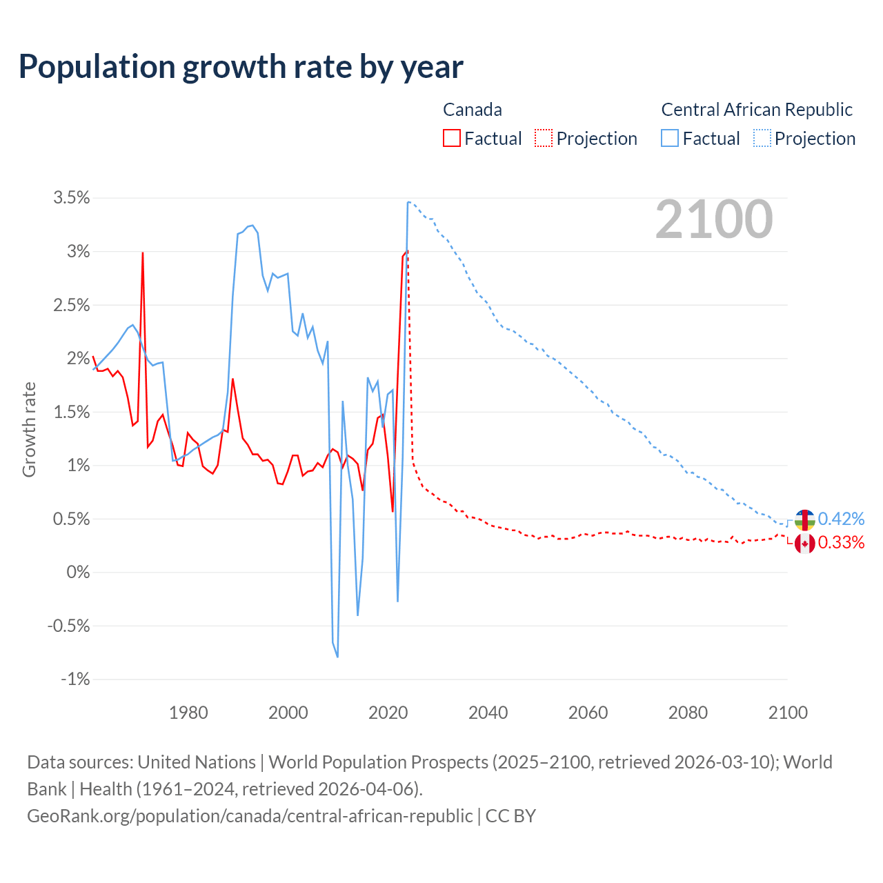 - For the last 10 years, Canada has had an average growth rate of +1.5% per year vs +1.27% in the Central African Republic.