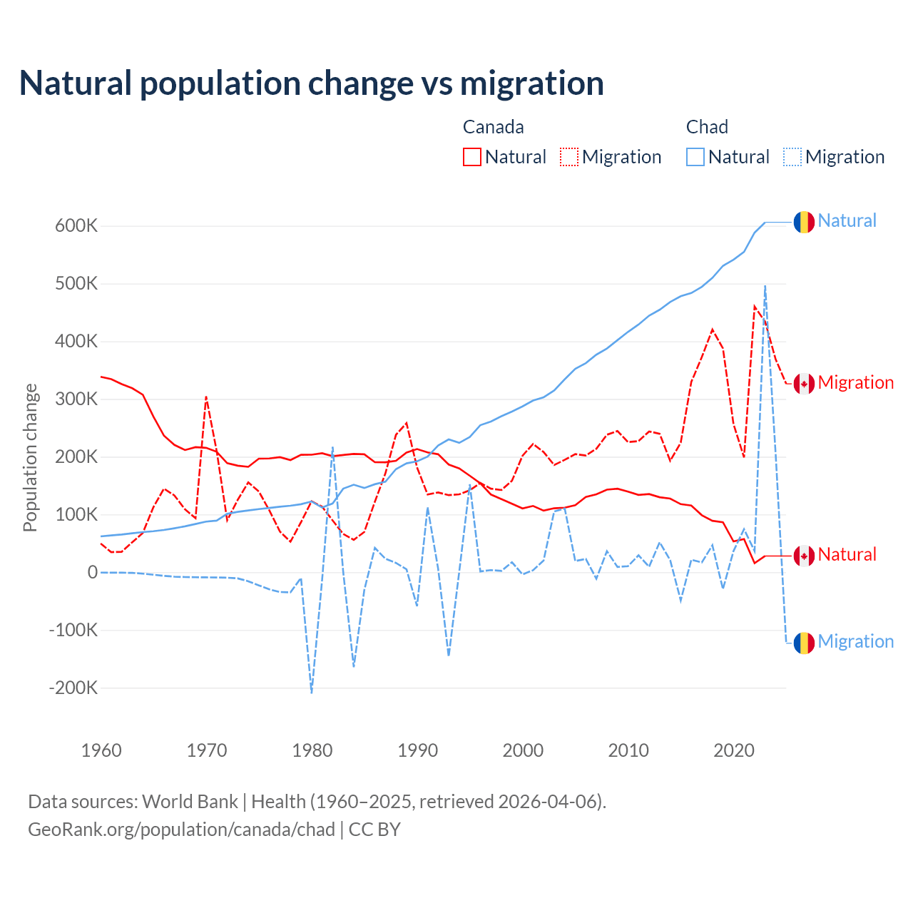 Over the last 10 years, 19.4% of the population change in Canada is from natural causes (a gain of 789,345 people) and 80.6% is from migration (a gain of 3,276,554 people). In Chad 88.7% is from natural causes (a gain of 5,253,964 people) and 11.3% is from migration (a gain of 672,204 people).