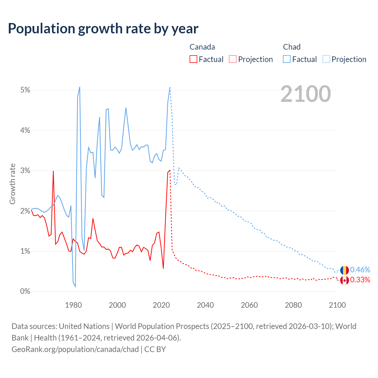 - For the last 10 years, Canada has had an average growth rate of +1.5% per year vs +3.65% in Chad.