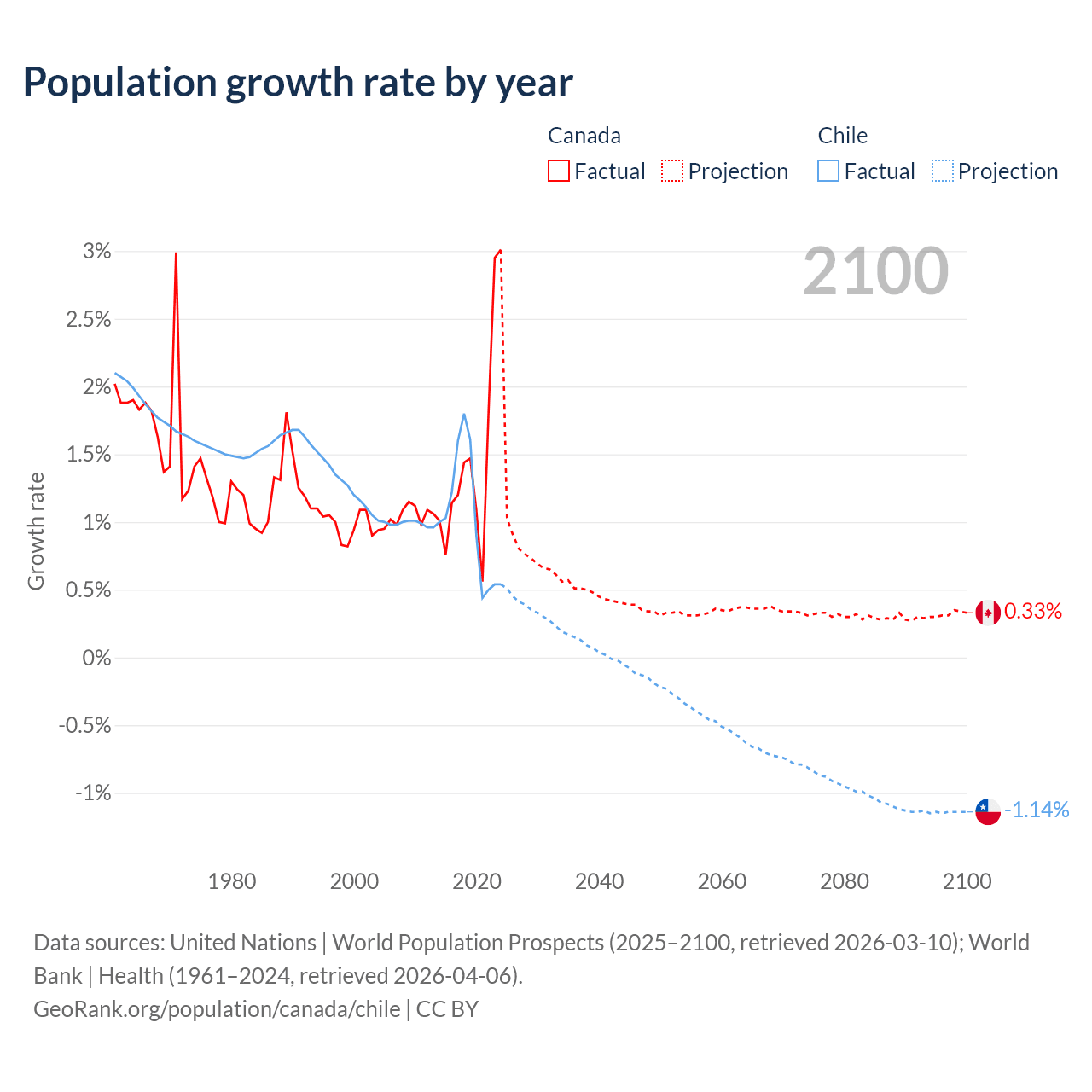 - For the last 10 years, Canada has had an average growth rate of +1.5% per year vs +1.02% in Chile.