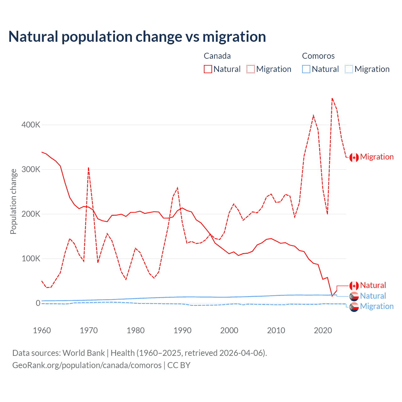 Over the last 10 years, 19.4% of the population change in Canada is from natural causes (a gain of 789,345 people) and 80.6% is from migration (a gain of 3,276,554 people). In Comoros 87.9% is from natural causes (a gain of 179,319 people) and 12.1% is from migration (a loss of 24,709 people).