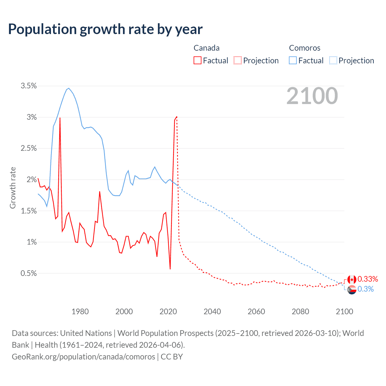 - For the last 10 years, Canada has had an average growth rate of +1.5% per year vs +2.01% in Comoros.