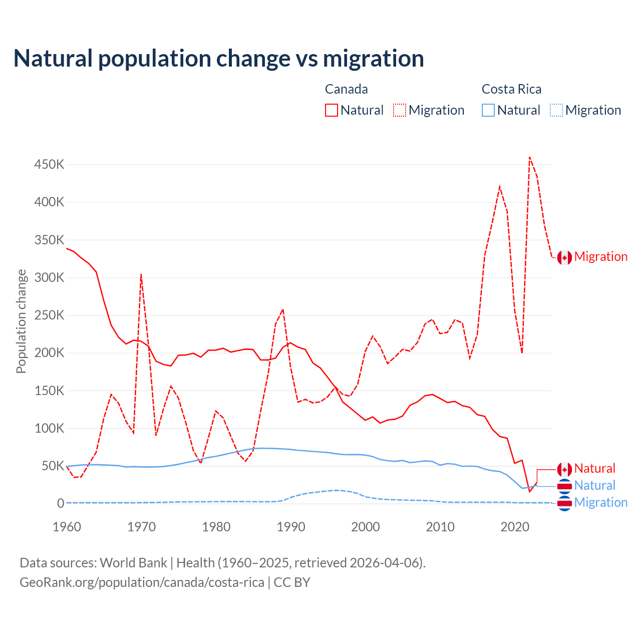 Over the last 10 years, 19.4% of the population change in Canada is from natural causes (a gain of 789,345 people) and 80.6% is from migration (a gain of 3,276,554 people). In Costa Rica 96.3% is from natural causes (a gain of 362,624 people) and 3.69% is from migration (a gain of 13,900 people).
