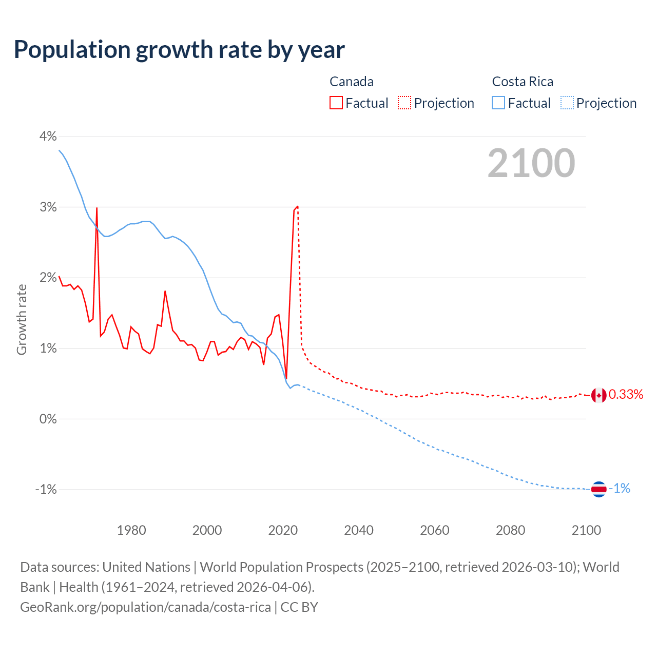 - For the last 10 years, Canada has had an average growth rate of +1.5% per year vs +0.77% in Costa Rica.