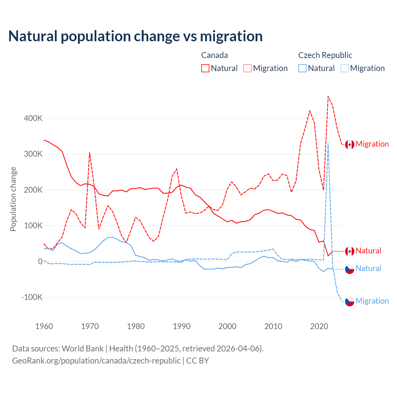 Over the last 10 years, 19.4% of the population change in Canada is from natural causes (a gain of 789,345 people) and 80.6% is from migration (a gain of 3,276,554 people). In the Czech Republic 17.3% is from natural causes (a loss of 74,826 people) and 82.7% is from migration (a gain of 357,502 people).