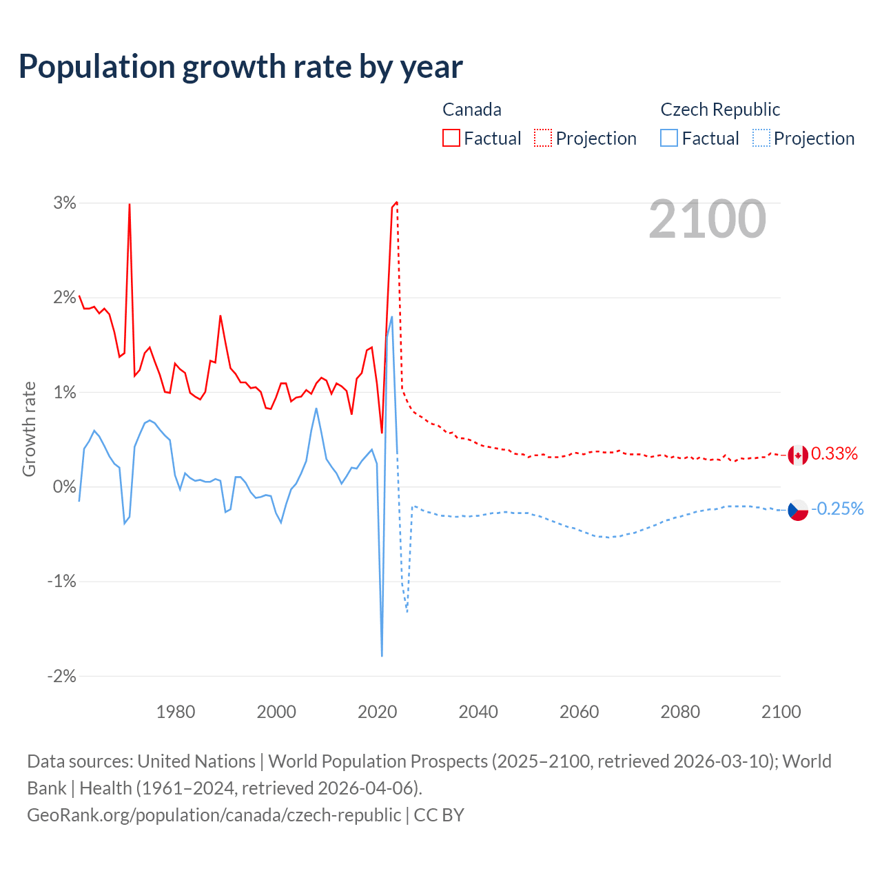 - For the last 10 years, Canada has had an average growth rate of +1.5% per year vs +0.34% in the Czech Republic.
