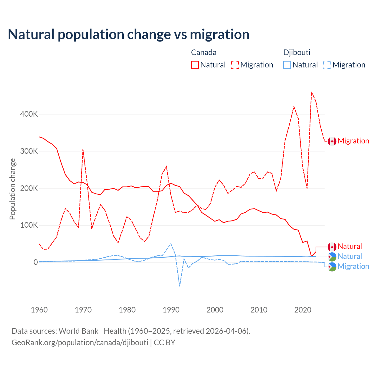 Over the last 10 years, 19.4% of the population change in Canada is from natural causes (a gain of 789,345 people) and 80.6% is from migration (a gain of 3,276,554 people). In Djibouti 92.1% is from natural causes (a gain of 153,892 people) and 7.87% is from migration (a gain of 13,138 people).