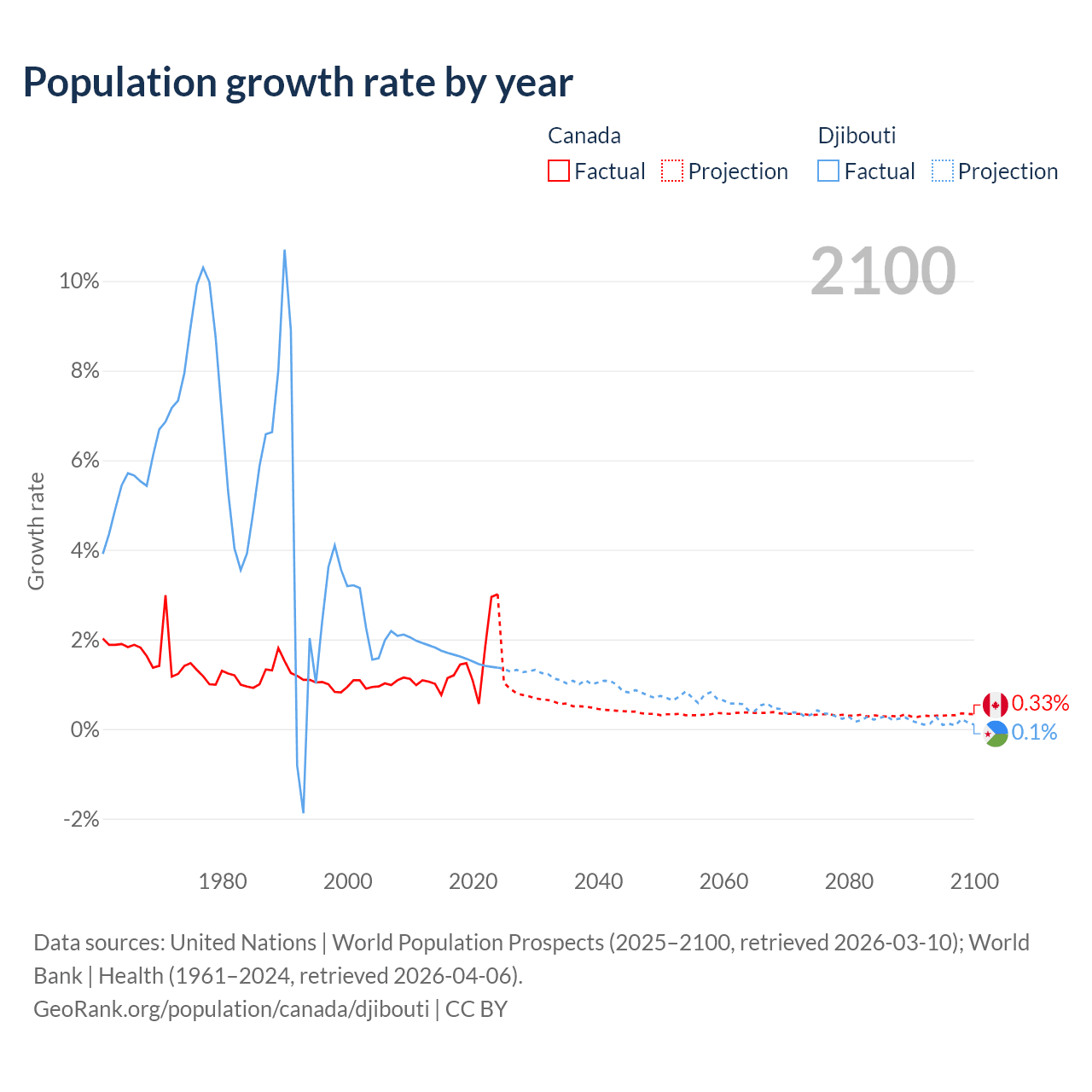 - For the last 10 years, Canada has had an average growth rate of +1.5% per year vs +1.57% in Djibouti.
