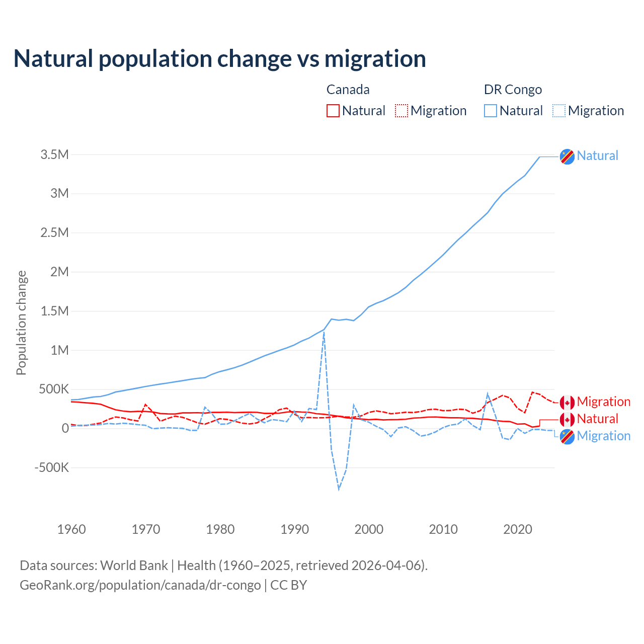 Over the last 10 years, 19.4% of the population change in Canada is from natural causes (a gain of 789,345 people) and 80.6% is from migration (a gain of 3,276,554 people). In the DR Congo 99.1% is from natural causes (a gain of 30,150,516 people) and 0.89% is from migration (a gain of 270,872 people).