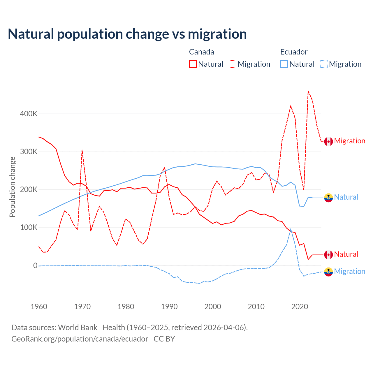 Over the last 10 years, 19.4% of the population change in Canada is from natural causes (a gain of 789,345 people) and 80.6% is from migration (a gain of 3,276,554 people). In Ecuador 91.9% is from natural causes (a gain of 1,964,352 people) and 8.08% is from migration (a gain of 172,707 people).