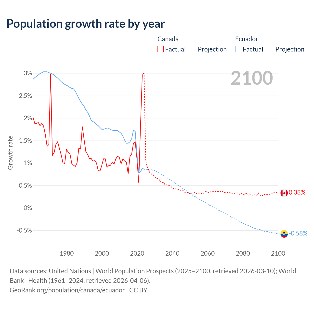 - For the last 10 years, Canada has had an average growth rate of +1.5% per year vs +1.26% in Ecuador.