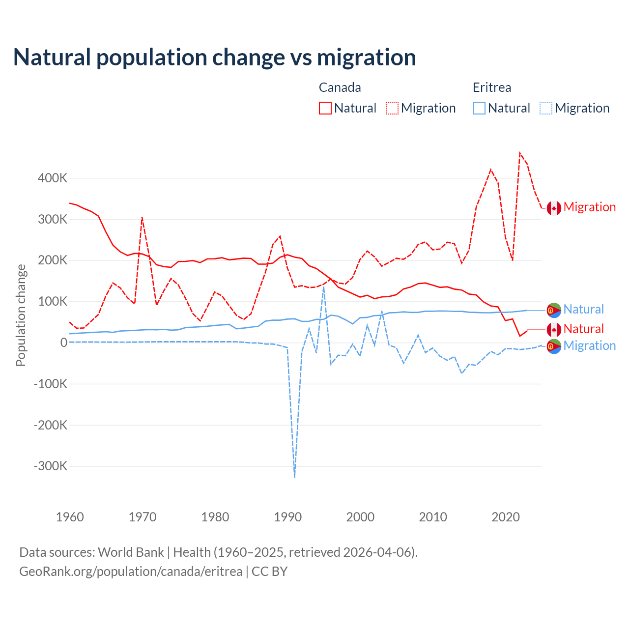 Over the last 10 years, 19.4% of the population change in Canada is from natural causes (a gain of 789,345 people) and 80.6% is from migration (a gain of 3,276,554 people). In Eritrea 68.8% is from natural causes (a gain of 742,837 people) and 31.2% is from migration (a loss of 336,243 people).