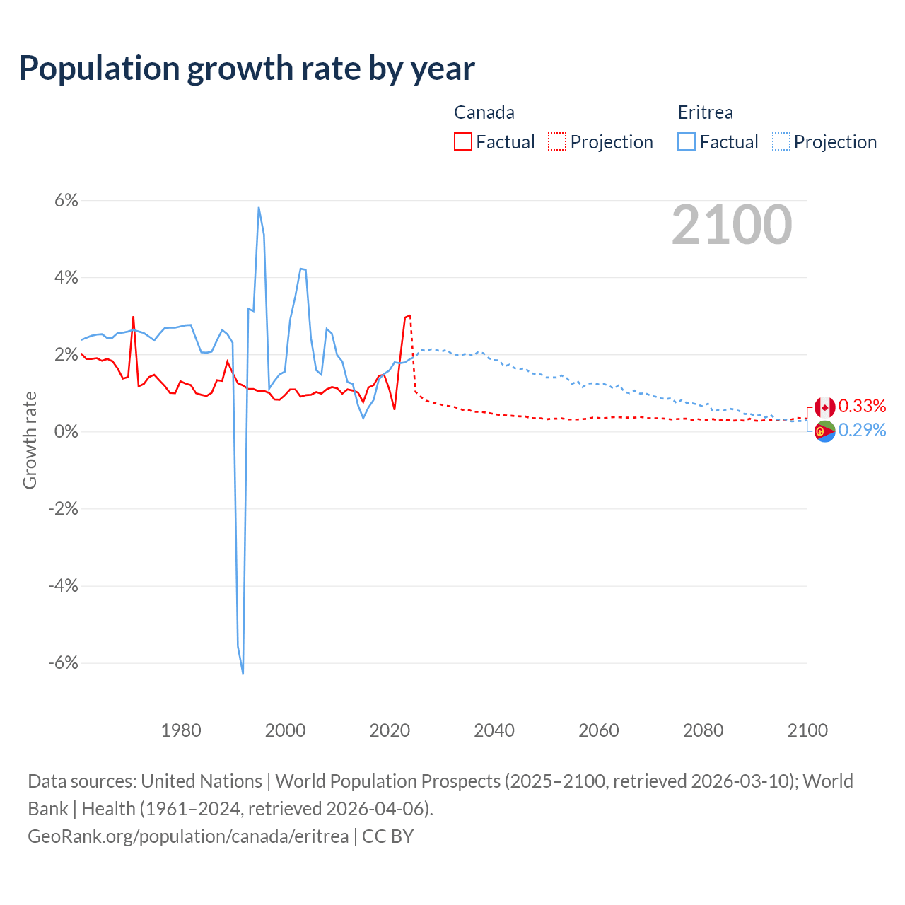 - For the last 10 years, Canada has had an average growth rate of +1.5% per year vs +1.28% in Eritrea.