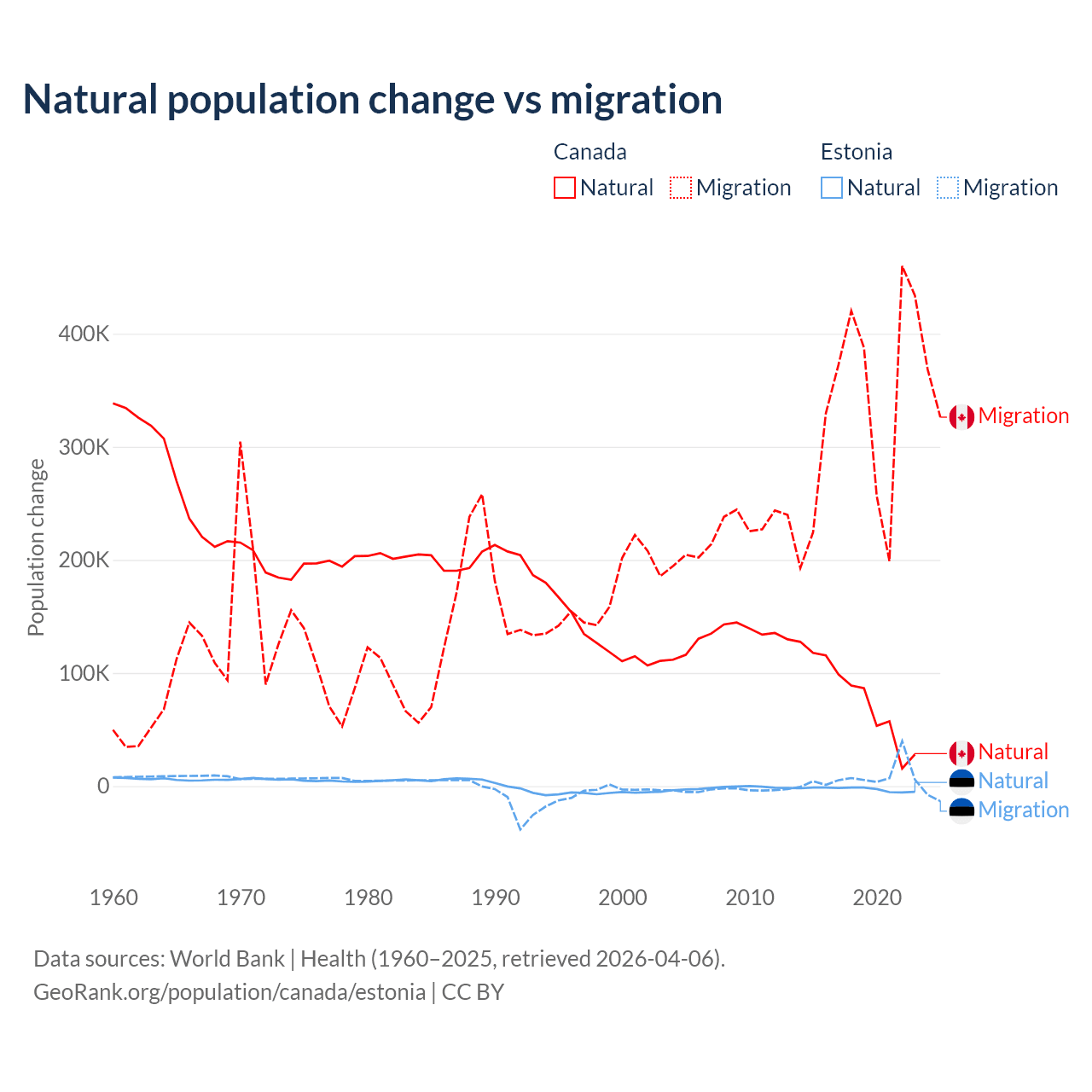 Over the last 10 years, 19.4% of the population change in Canada is from natural causes (a gain of 789,345 people) and 80.6% is from migration (a gain of 3,276,554 people). In Estonia 26.1% is from natural causes (a loss of 27,683 people) and 73.9% is from migration (a gain of 78,553 people).