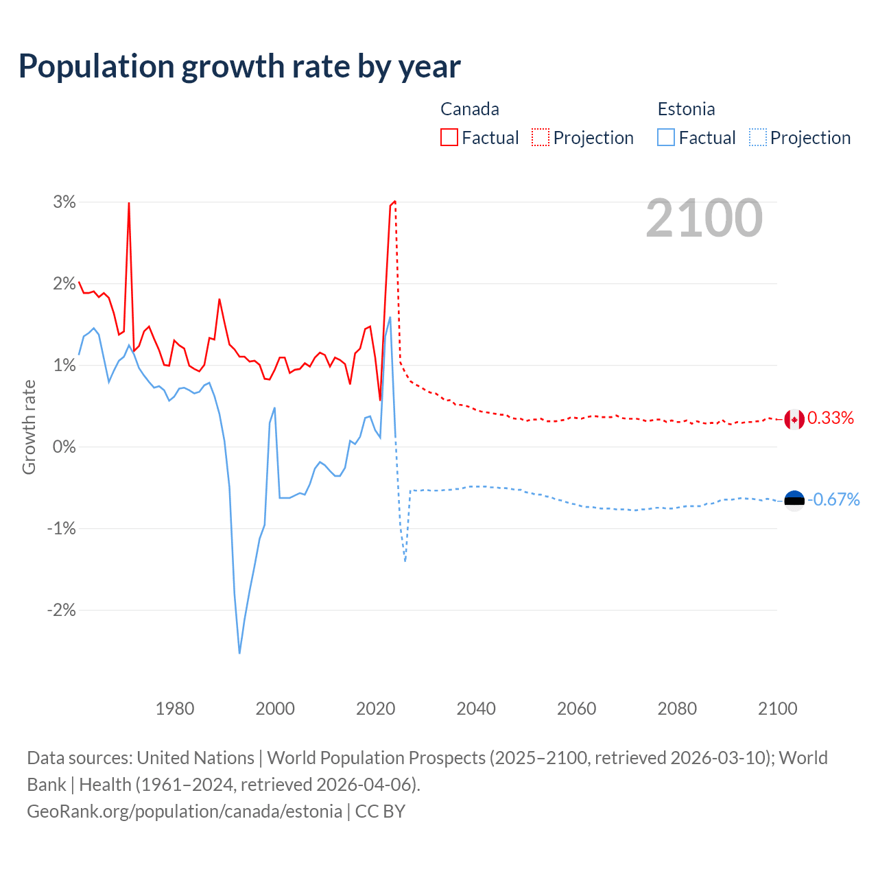 - For the last 10 years, Canada has had an average growth rate of +1.5% per year vs +0.37% in Estonia.