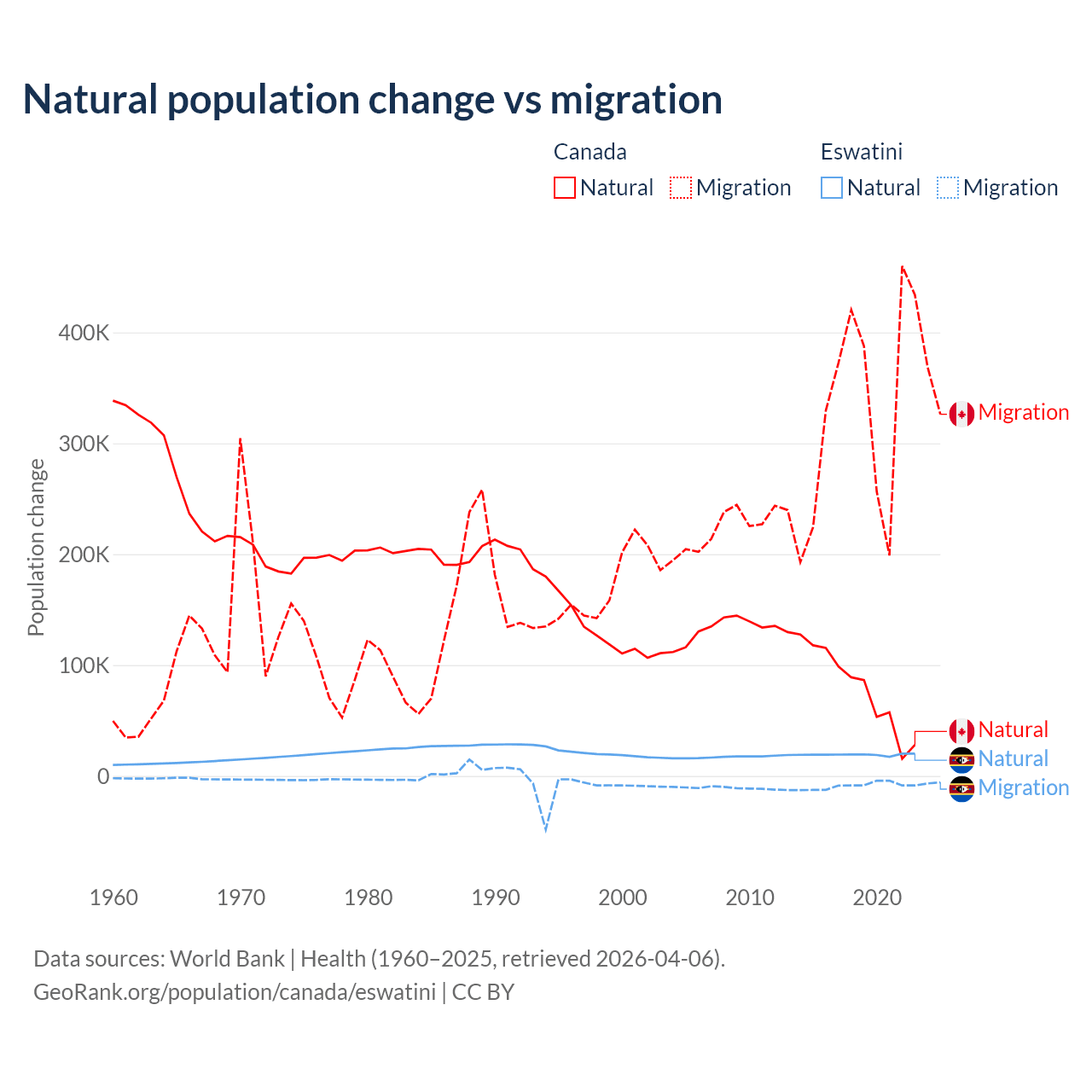 Over the last 10 years, 19.4% of the population change in Canada is from natural causes (a gain of 789,345 people) and 80.6% is from migration (a gain of 3,276,554 people). In Eswatini 68.3% is from natural causes (a gain of 192,206 people) and 31.7% is from migration (a loss of 89,012 people).