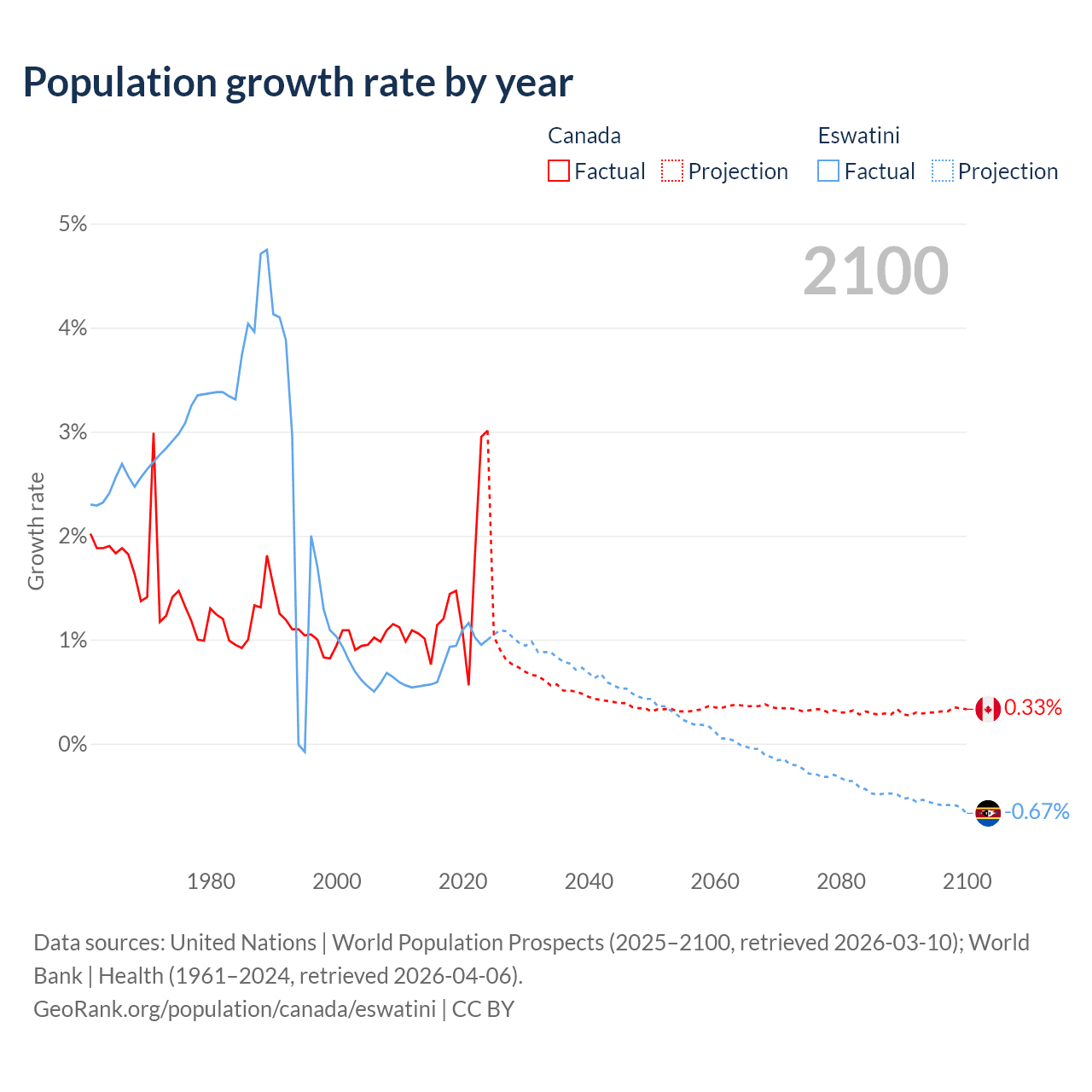 - For the last 10 years, Canada has had an average growth rate of +1.5% per year vs +0.87% in Eswatini.