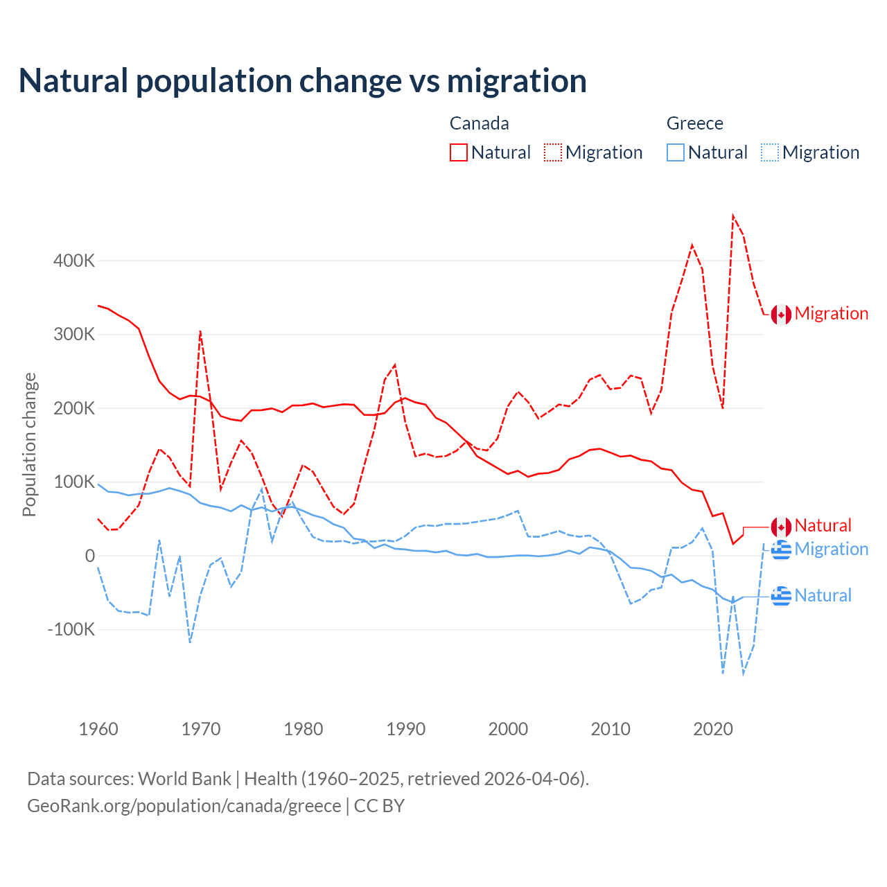 Over the last 10 years, 19.4% of the population change in Canada is from natural causes (a gain of 789,345 people) and 80.6% is from migration (a gain of 3,276,554 people). In Greece 51.9% is from natural causes (a loss of 411,426 people) and 48.1% is from migration (a loss of 381,824 people).