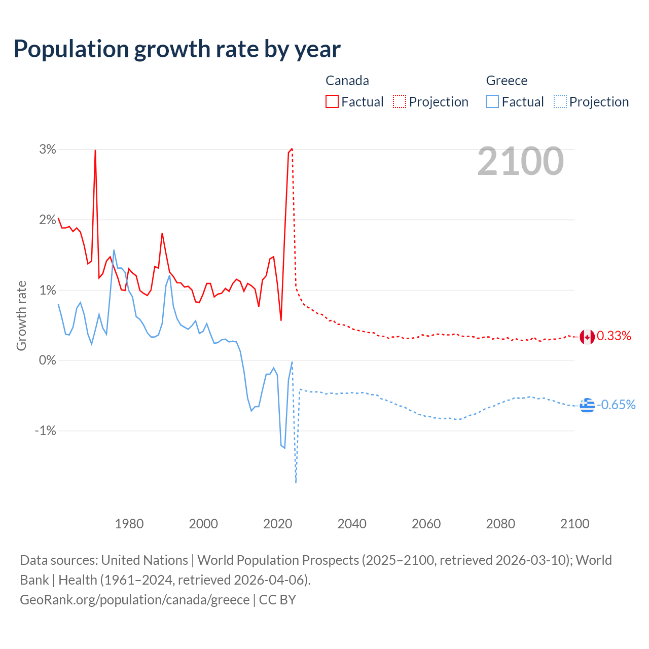 - For the last 10 years, Canada has had an average growth rate of +1.5% per year vs -0.47% in Greece.