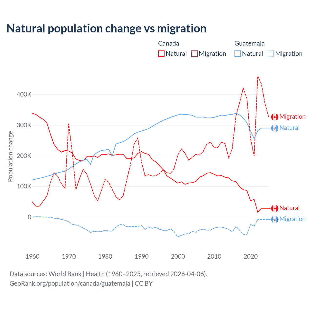 Over the last 10 years, 19.4% of the population change in Canada is from natural causes (a gain of 789,345 people) and 80.6% is from migration (a gain of 3,276,554 people). In Guatemala 89.8% is from natural causes (a gain of 3,077,847 people) and 10.2% is from migration (a loss of 347,818 people).
