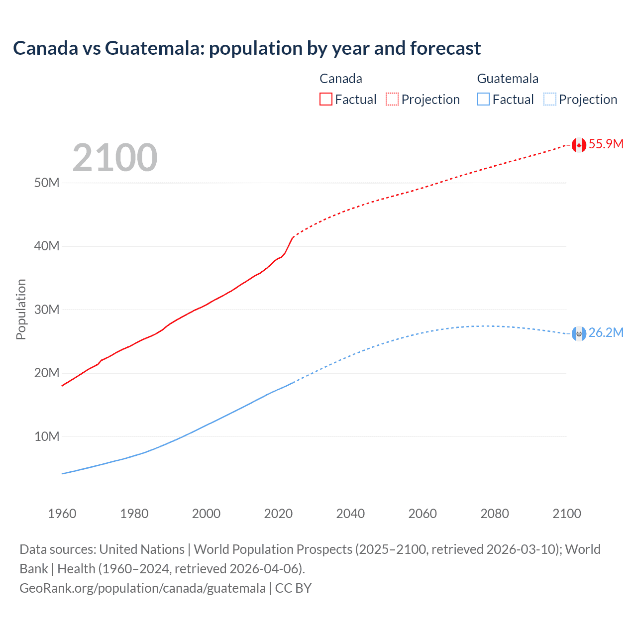 Canada vs Guatemala: population by year and forecast