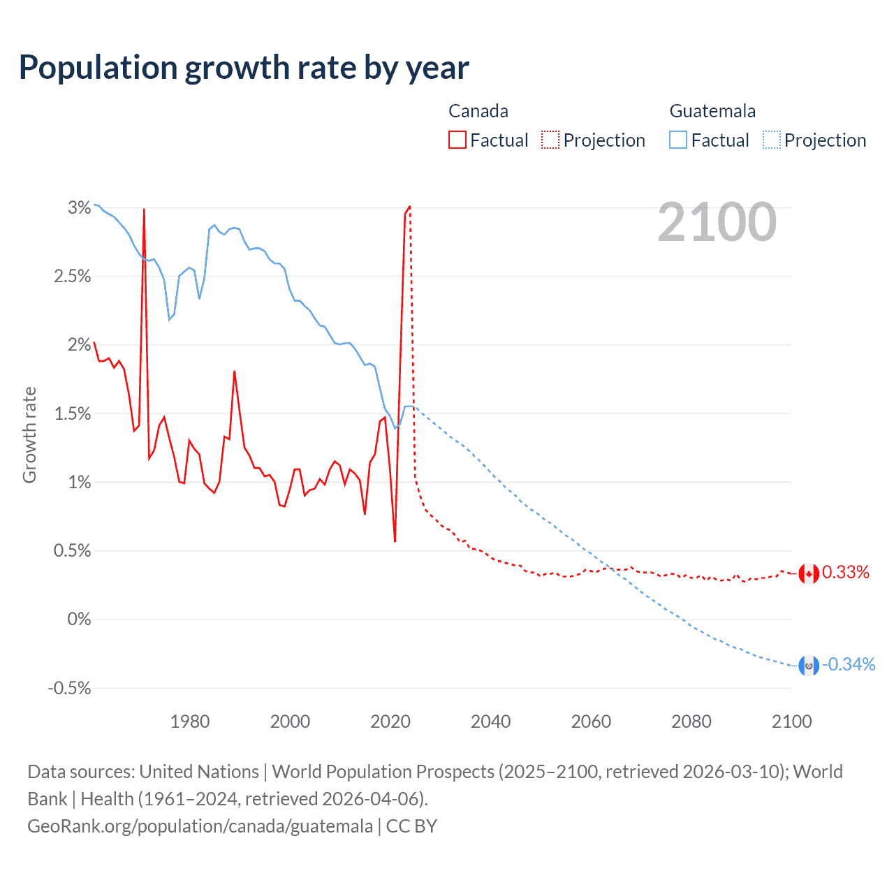 - For the last 10 years, Canada has had an average growth rate of +1.5% per year vs +1.64% in Guatemala.