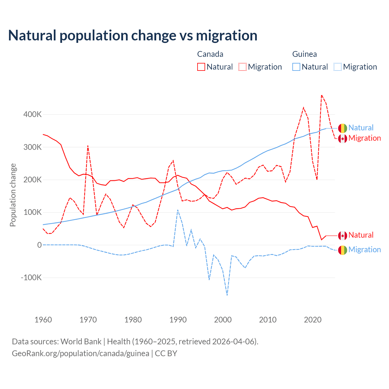 Over the last 10 years, 19.4% of the population change in Canada is from natural causes (a gain of 789,345 people) and 80.6% is from migration (a gain of 3,276,554 people). In Guinea 97.2% is from natural causes (a gain of 3,346,936 people) and 2.76% is from migration (a loss of 94,924 people).