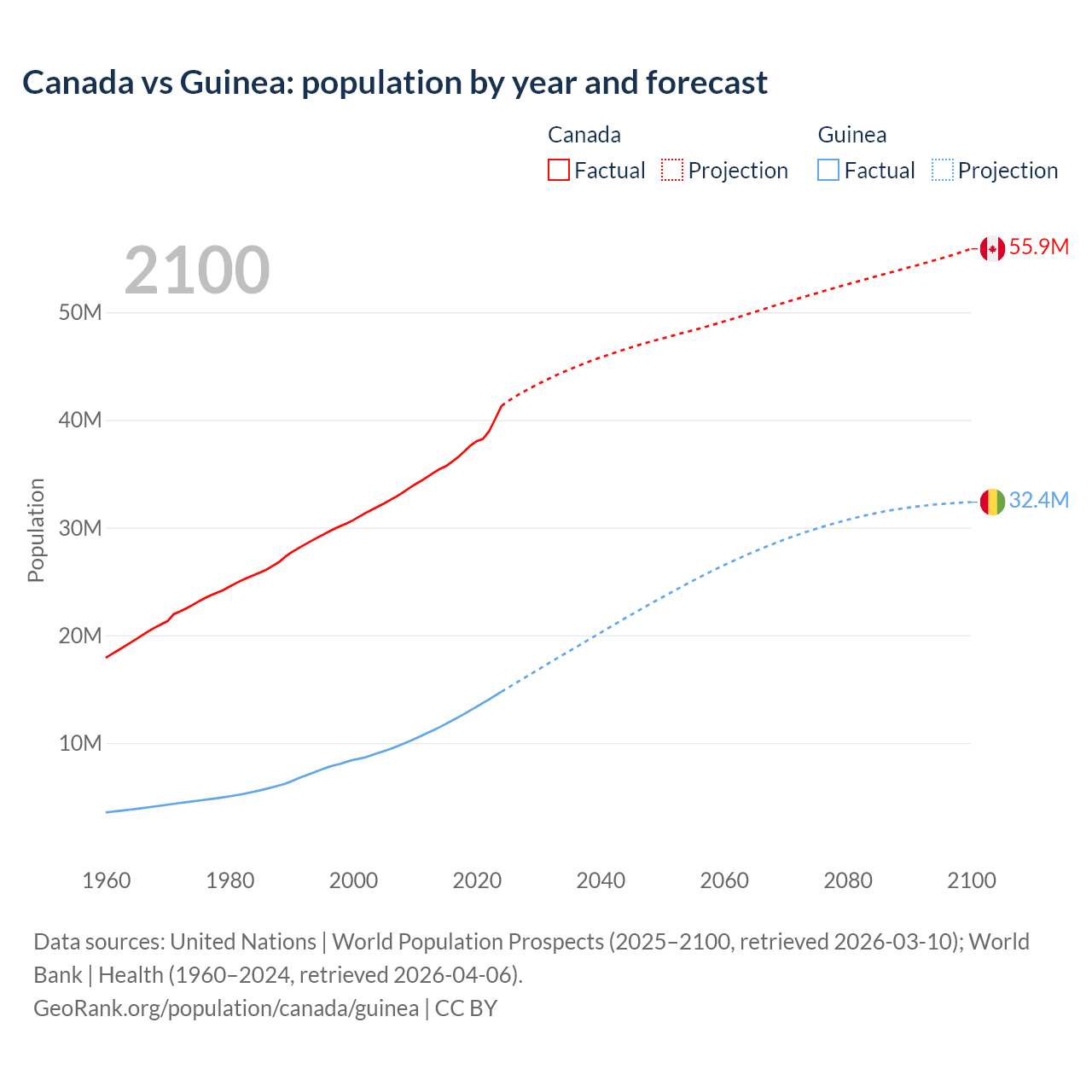Canada vs Guinea: population by year and forecast